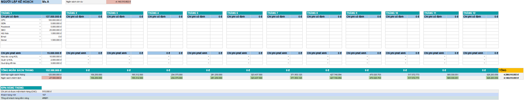 Bằng cách theo dõi chi tiết các khoản chi phí cố định và chi phí phát sinh theo từng tháng, marketer có thể dễ dàng tổng hợp và lập kế hoạch ngân sách marketing cho cả năm. File Excel mẫu đã được tích hợp sẵn công thức tính toán, giúp việc sử dụng nhanh chóng và thuận tiện.