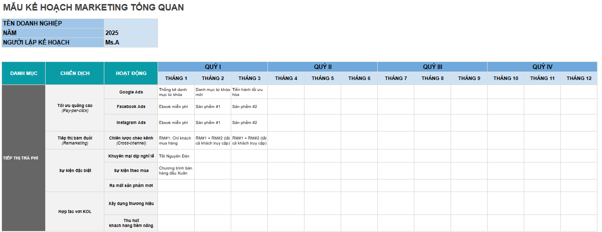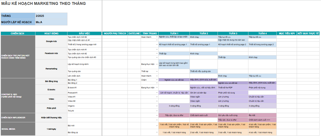 Khi các hạng mục công việc được chia nhỏ và sắp xếp theo từng tháng, marketer có thể dễ dàng theo dõi tiến độ thực hiện, đảm bảo mọi hoạt động đi đúng kế hoạch. Đồng thời, mẫu này cũng giúp so sánh nhanh chóng giữa kết quả thực tế và KPIs mục tiêu đã đặt ra.