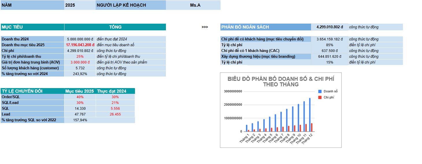 Đây là một mẫu kế hoạch thiết lập mục tiêu & KPIs Marketing với sẵn công thức tính cho những chỉ số cơ bản mà hầu hết bộ phận Marketing đều theo dõi, bao gồm: Doanh số, Chi phí/ Doanh số, Số lượng SQL, Số lượng Lead, Tỷ lệ chuyển đổi, và Phân bổ mục tiêu theo từng tháng.